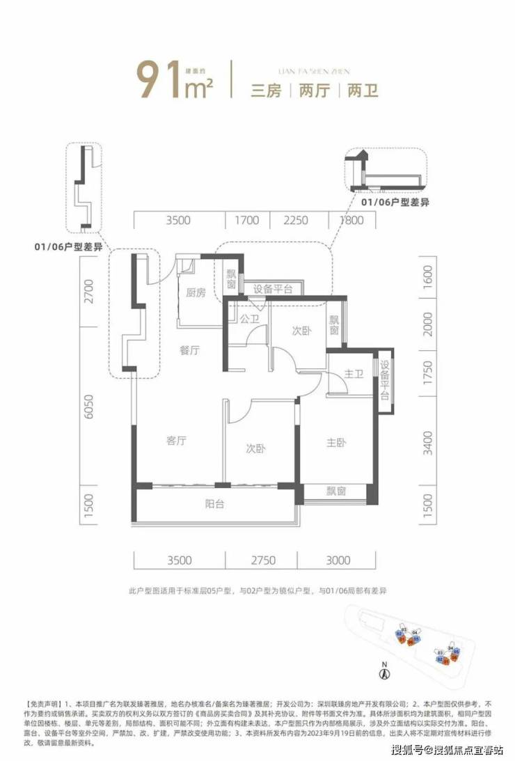 建面约91㎡三房两卫:三开间朝南,客厅3.5米开间,配备约6.25米南向超长阳台,采用创变LDKG一体化设计。公卫三段式分离设计,动静分区明显,