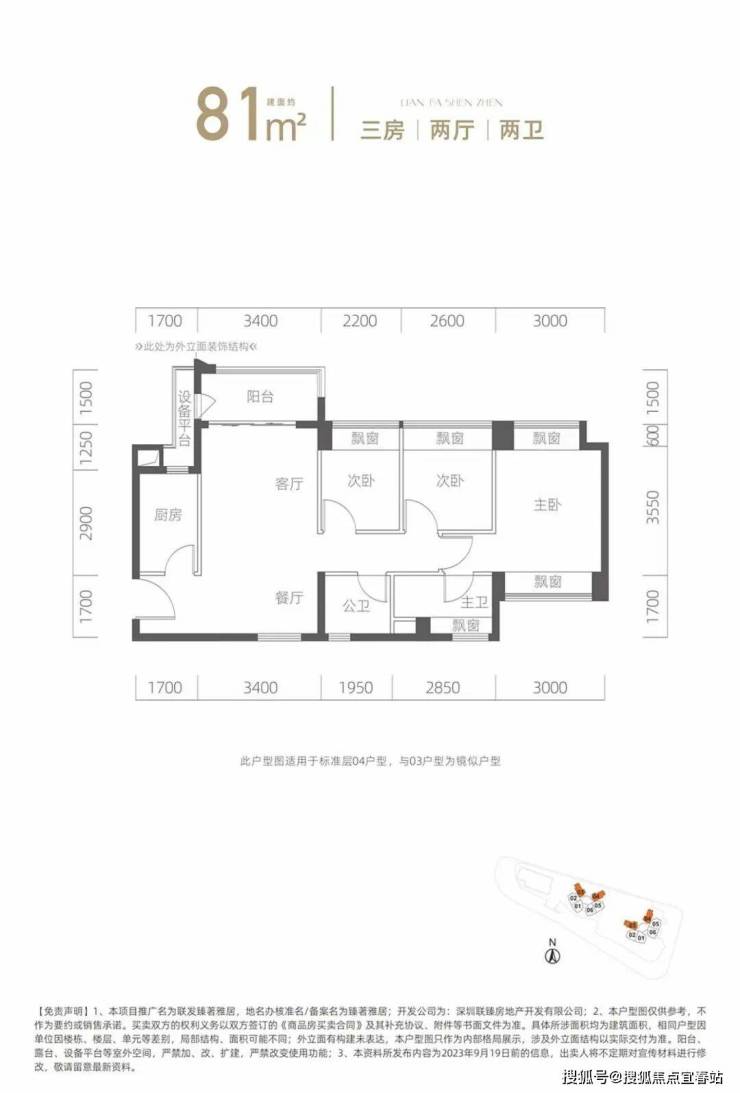 建面约81㎡三房两卫:采用竖厅南北通透格局,客厅3.4米开间,卧室宽度分别达3米、2.6米与2.2米,L型厨房设计动线流畅。
