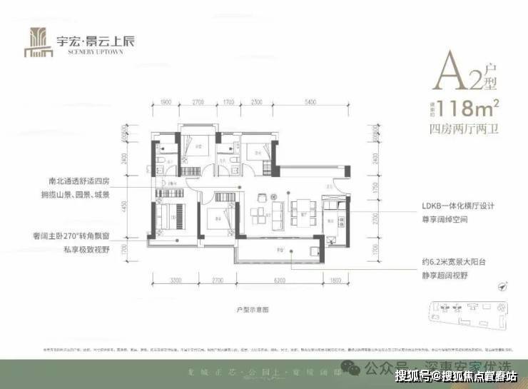 118㎡的4房2厅2卫,设计的是横厅南北通透格局,客餐厅6.2米开间,LDKB一体化,五开间朝南,西北面5.4米长的观景大飘窗,分别做到了主卧16.66㎡/次卧9.72㎡/次卧9.18㎡/次卧6.9㎡(包含墙体飘窗),L型厨房,卫生间干湿分离,得房率约76%(不含赠送),客厅连接餐厅位出6.2米长的大阳台约10.54平,东南朝向。