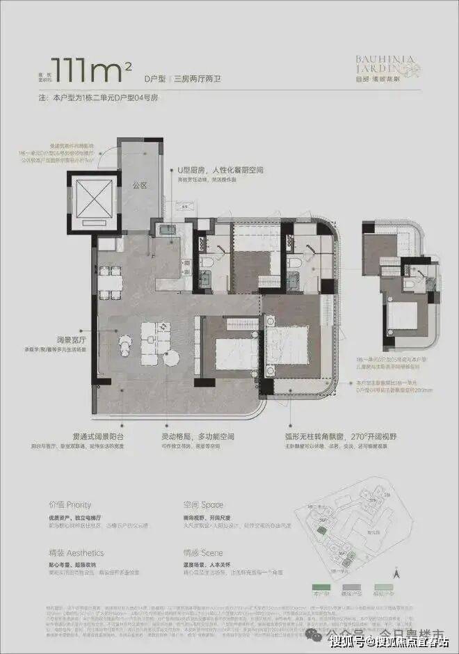 双龙抱珠户型,整个户型非常通透。书房分布于客厅另一侧,难得的双面采光+270°景观视野。主卧南北通透,景观面开阔。