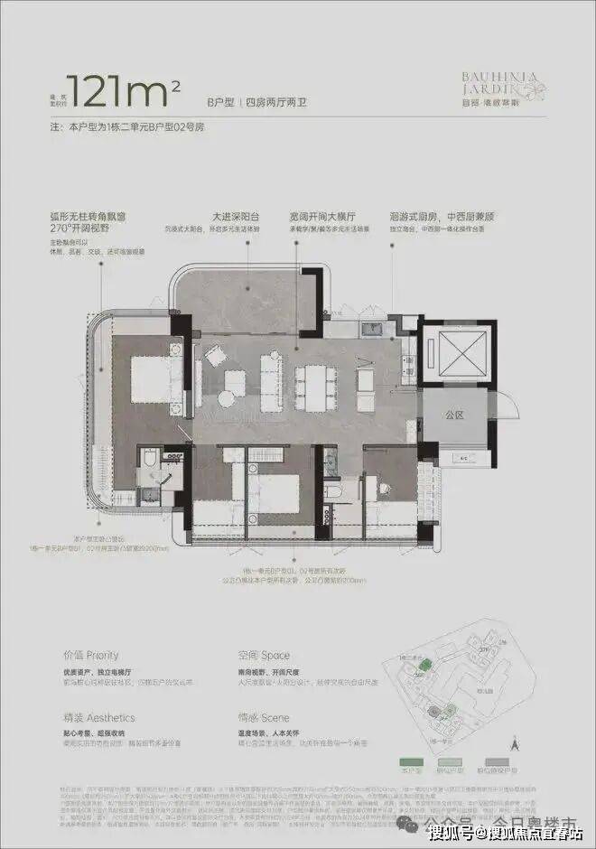 四房为主,多种厅式可选;大面积的飘窗利用,采光面大、实用率高;转角处使用弧形玻璃且都是无柱设计,景观视野佳;
