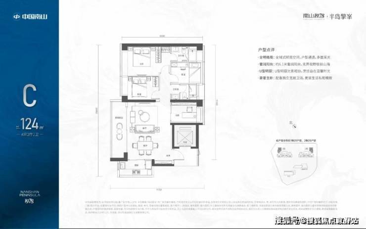 124㎡的3+1房2厅2卫,1栋02/2栋04户型,电梯入户送独立公区,设计的是竖厅格局,LDKB一体化设计,动静分区,主卧套间设计,还有一个多功能间可以做书房,U型厨房,公卫三段式分离,得房率:72.07%(不含赠送),西南朝向。