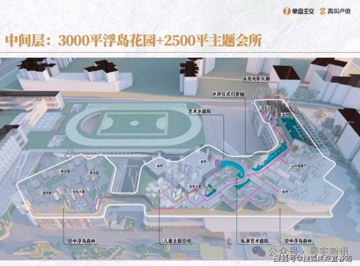利用裙房屋顶打造拥有“仪式水轴“艺术庭院”“空中浮岛森林”三级景观设计的空中庭院,四栋住宅均漂浮于甲板之上,独享甲板庭院花园,以“海风吹拂下的豪宅底盘”托举城市上空的豪宅群落,形成立体景观系统。