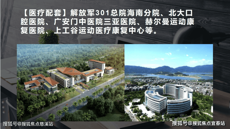 【医疗配套】解放军301总院海南分院、北大口腔医院、广安门中医院三亚医院、赫尔曼运动康复医院、上工谷运动医疗康复中心等。