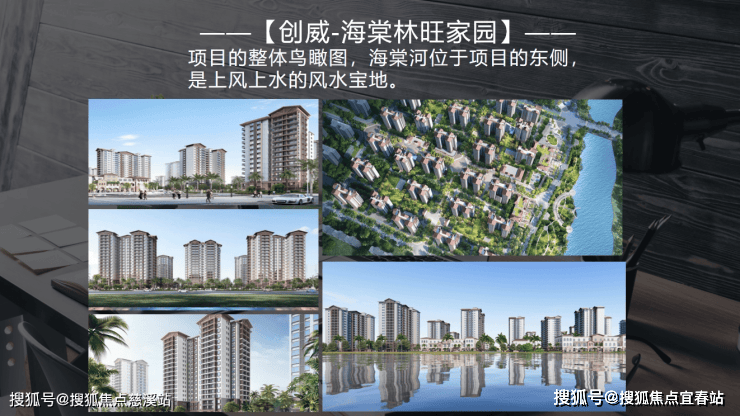 项目的整体鸟瞰图,海棠河位于项目的东侧,是上风上水的风水宝地。