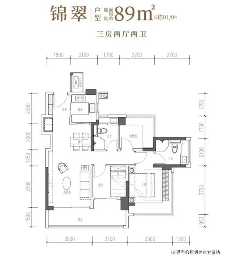 89㎡的3房2厅2卫,6栋01/04户型,设计的是经典竖厅格局,客厅3.5米开间,LDKB一体化,S墙设计预留冰箱卡槽位,三开间朝南,动静分区,主卧+次卧270°无柱转角飘窗,卫生间干湿分离,得房率约97.47%(包含赠送),客厅连接次卧出大阳台约11.46平,西南或东南朝向。
