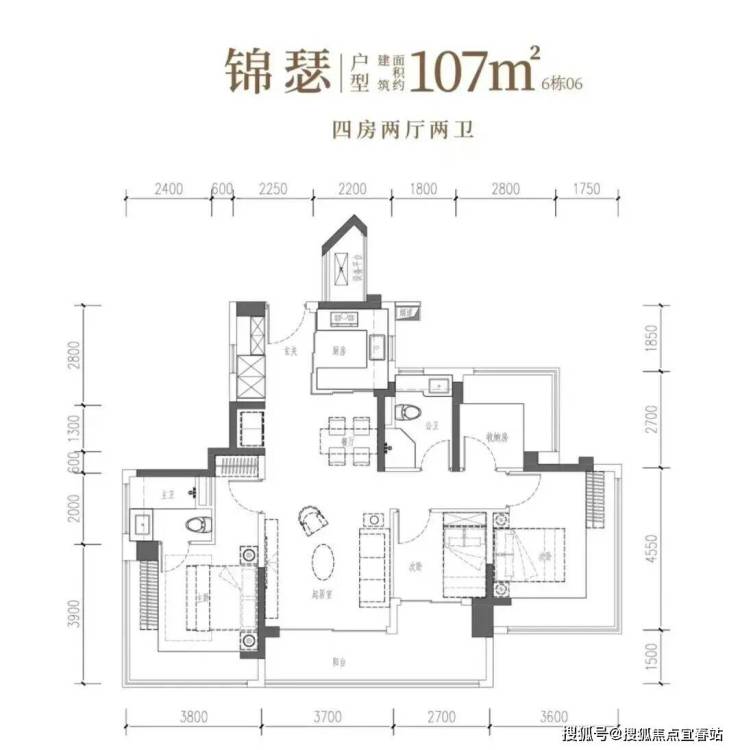 107㎡的4房2厅2卫,设计的是竖厅双龙抱珠格局,客厅3.7米开间,LDKB一体化设计,预留冰箱卡槽位,四开间朝南,主卧+2个次卧270°无柱转角飘窗,卫生间干湿分离,得房率约104.06%(包含赠送),客厅连接次卧出超大阳台约11.76平,东北朝向。