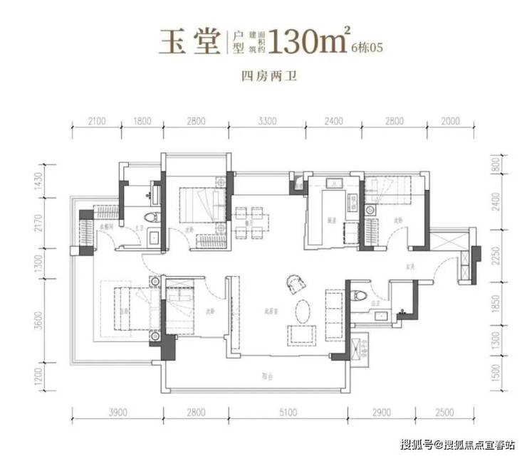 130㎡的4房2厅2卫,设计的是竖厅南北通透格局,进门独立玄关,客厅5.1米开间,客餐厅分离化设计,主卧270°无柱转角飘窗+衣帽间,卫生间干湿分离,得房率约101.95%(包含赠送),客厅连接次卧出超大阳台约14.09平,东北朝向。