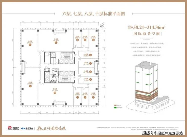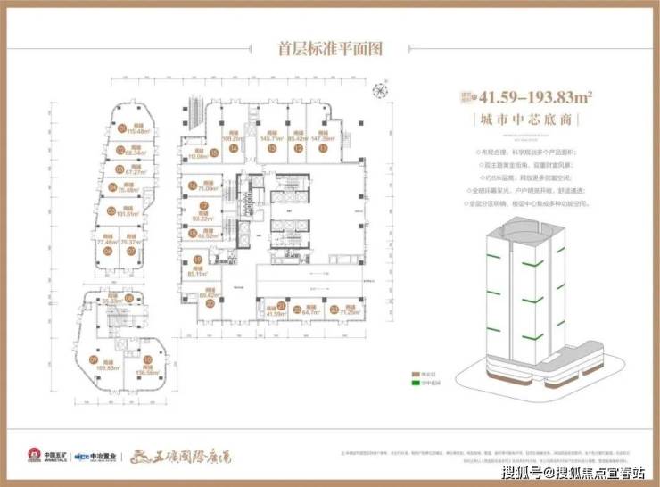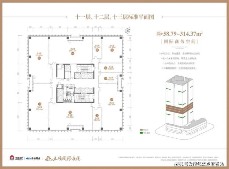 【楼栋概况】楼体高度110米,地下二层地上22层,1-4层为城市中芯底商,首层层高约6米、2层层高约为4.5米、3/4层层高约为4.35米;5至18层为国际商务空间,层高约为4.2米。