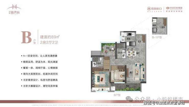 79㎡2+1房:3开间朝南,主卧带飘窗,N+1空间可改造为书房或儿童房,适合年轻家庭。