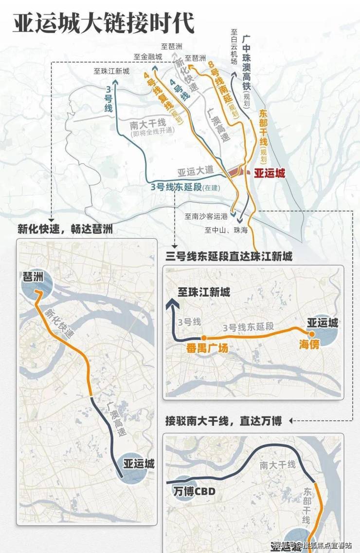 板块内有已经开通的4号线,6站直达琶洲,7站天河,还有即将开通的3号线东延段,通过3号线海傍站,可以直达珠江新城和体育西,再也不用4号线换5号线了,通勤更加方便,而且海傍站还是始发站,不用担心没座位的问题,还有规划中的8号线南延线,自驾的话,出门就是亚运大道,广澳高速可连接新化快速,开车去琶洲也非常方便。