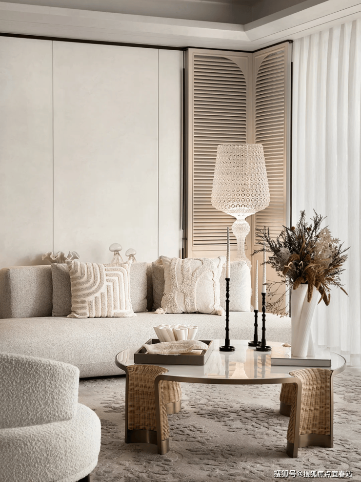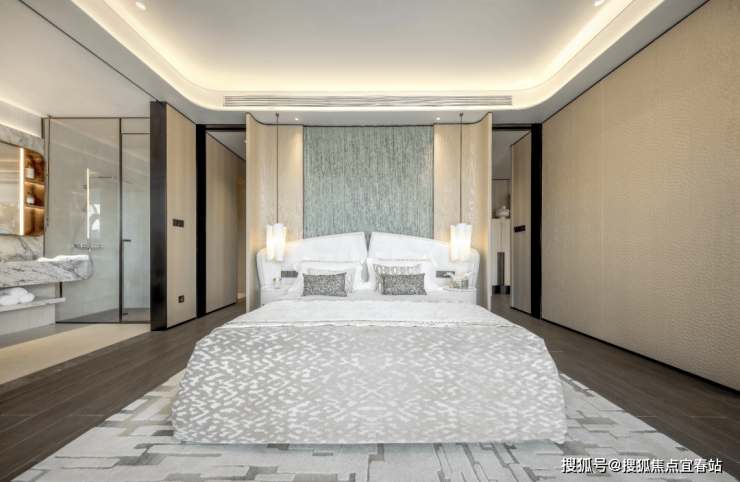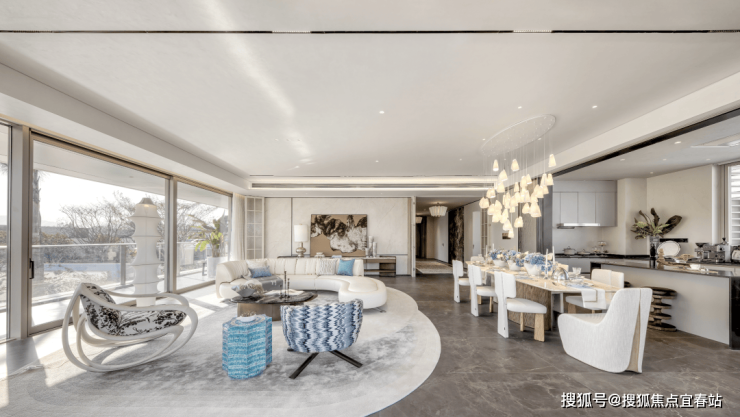 步入室内,就是约10㎡的私享电梯前厅,层高约3.5m,三面采光的公区,270°无柱环形端厅,延伸出约44米的观景面,尽显主人气场。