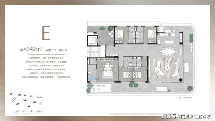 全系一梯一户,其270°全景端厅,将“客厅+餐厅+厨房+阳台”形成一个LDKB连贯空间,通透无柱,环幕式视野无限开阔,打造家族社交门面。