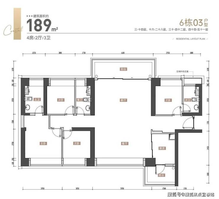 户型面积布局02189平四房两厅三卫户型除了双龙抱珠格局优势外还是南北通透的,客厅直连约6米宽、1.7米深的休闲大阳台,餐厅也设计有约4.6米宽的景观飘窗,与客厅的景观阳台呼应,使整个户型格局更加通透敞亮。户型亮点双套房三卫设计,让各个年龄层的洗漱习惯都有各自安放之处,居住的舒适度大大提高。