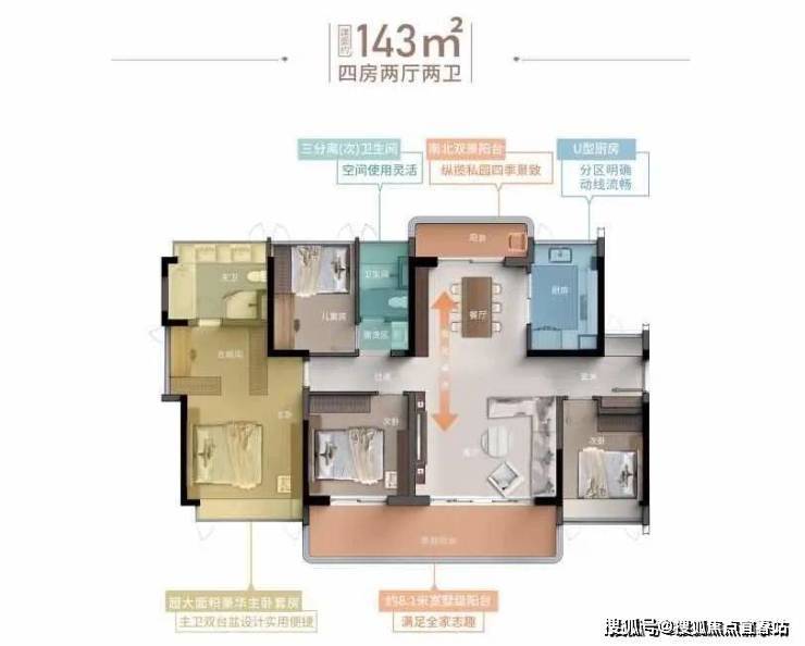 以建面约143㎡四房为例,项目对其内部空间进行了深度优化,在市场上脱颖而出,毫不夸张地说,其居住体验不输大平层豪宅。