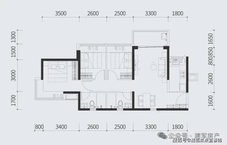 88㎡的3房2厅2卫,设计的竖厅格局,客厅3.3米开间,3个卧室分别是3.5米/2.6米/2.5米的宽度,主卧L型飘窗,L型厨房,得房率:77.73%(不含赠送),有西北或东北朝向。