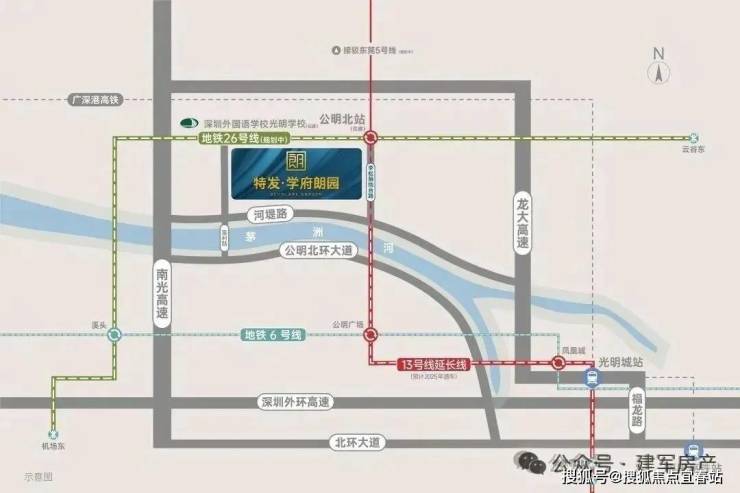 项目距13号线二期(北延)公明北站直线距离约200米,4站达公明广场,可换乘6号线通达宝安/光明/龙华/罗湖/福田