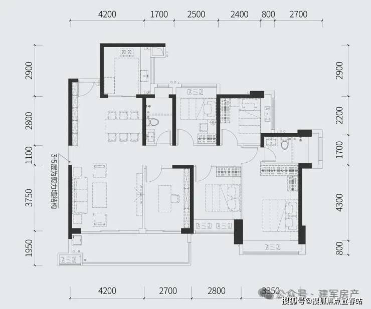 114㎡的4房2厅2卫,设计的竖厅格局,客厅3.7米开间,四开间朝南,4个卧室分别是3.1米/2.7米/2.6米/2.45米的宽度,客厅连接卧室带6.3米长大阳台,U型厨房,房,得房率:77.74%(不含赠送),有西南或东南朝向。