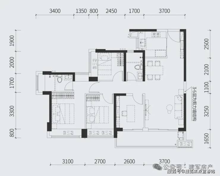 97㎡的3房2厅2卫,设计的竖厅格局,客厅3.45米开间,三开间朝南,3个卧室做到了3.1米/2.7米/2.5米的宽度,客厅连接卧室带6.15米长大阳台,U型厨房,得房率:77.73%(不含赠送),有东南向或西南朝向。
