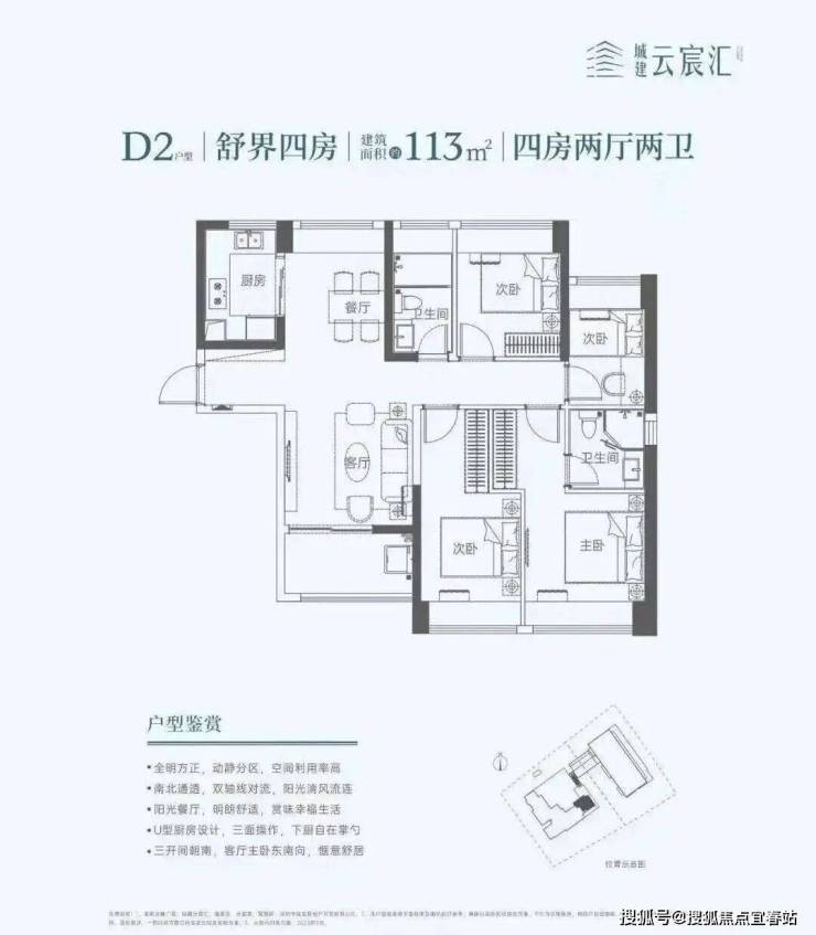 113㎡的4房2厅2卫,设计的竖厅南北通透格局,餐客厅一体化,U型厨房,阳台东南朝向