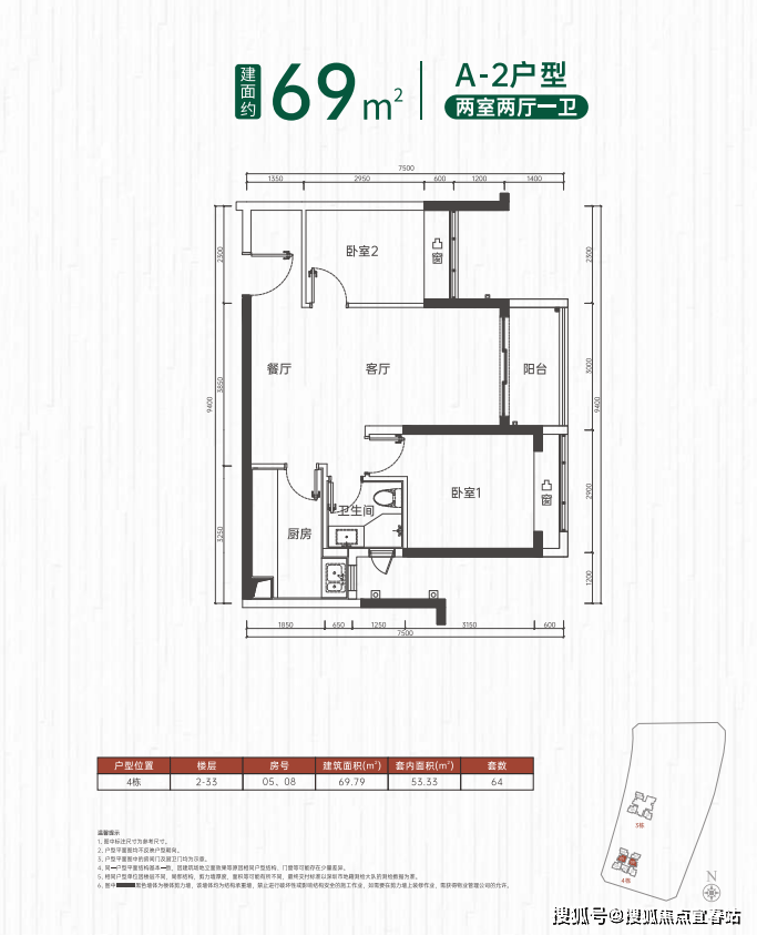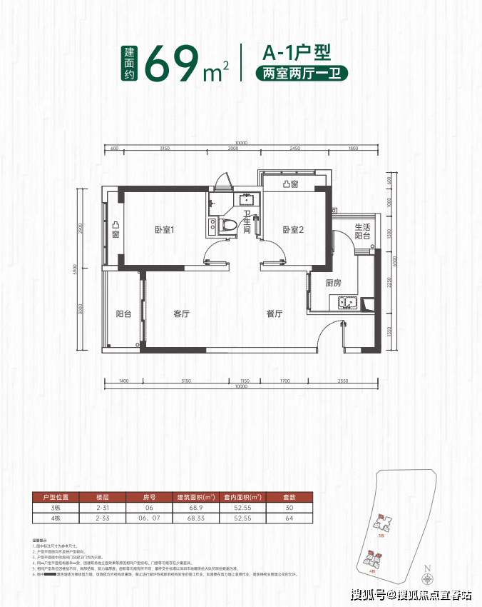 两房接近69㎡,共190套,总价约192-206万;