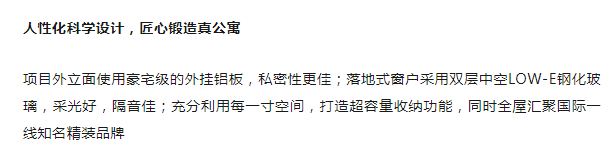 精琢豪配的墅质高品,满足安全、舒适、便捷、尊贵的居者需求 高MIX: 实现住宅、平层公寓、LOFT公寓、商办、商业、酒店等6种物业类别完美MIX;集居住、商务、休闲、娱乐、餐饮、社交等诸多功能于一体;打造成为:一站式精英生活领寓
