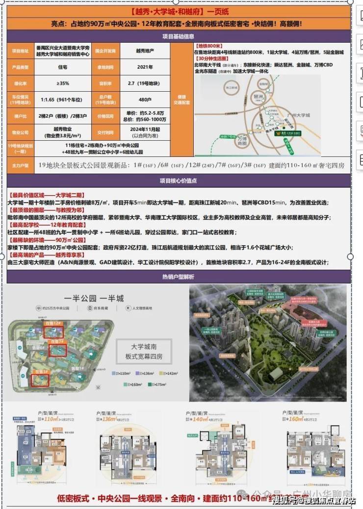 项目总占地面积 70000 平米,建筑面积达 296411 平米,规划有 24 栋建筑,共 872 户,产权年限为 70 年。在规划设计上,项目容积率低至 0.9,采用 16-24F 板式设计,绿化率高达 35%,绿化面积达 64920 平米,还配备 1916 个车位,车位配比 1:1.65,充分保障业主停车需求。项目由知名房企越秀地产开发,越秀地产深耕房地产领域多年,实力雄厚,无需担心烂尾风险,为项目品质保驾护航。物业公司为广州越秀物业发展有限公司,物业管理费 3.8 元 / 月 / 平米,专业的物业服务将为业主生活提供贴心保障。此外,项目分为 5 个地块,首开的 519 地块规划有 11 栋 16-24 层住宅和 2 栋 12 层商办楼,目前已有部分楼栋在售。🐎广州越秀大学城和樾府【售楼处电话】✅ 400-856-3771⭕(已认证)🎥❄️❇❇