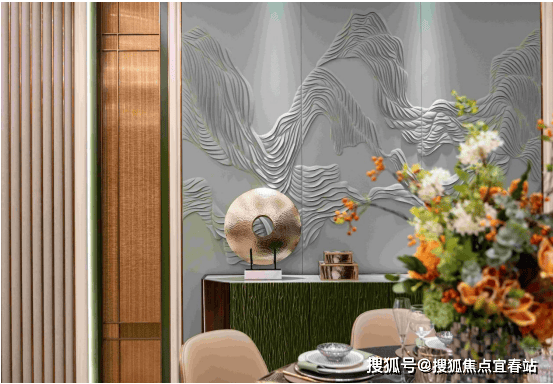 客厅背景墙为阿玛尼底材刺绣墙艺,营造清雅美学。