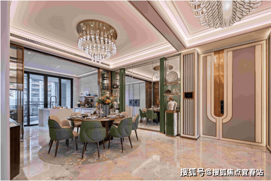 过厅背景墙采用青绿哑光烤漆圆弧造型搭配绿翡翠岩板;