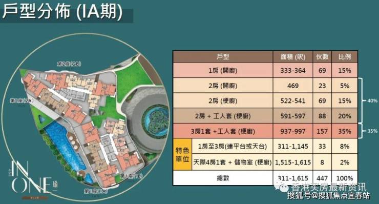 瑜一分三期(1A、1B及1C期)发展,合共844套。瑜一第IA期瑜一‧天海由第1座及第2座,提供447套,实用面积由311至1615平方呎,户型包括一至四房,不设开放式户,主打两房及三房,另设特色户。一房75套实用面积由311至364平方呎,约占17%;两房占192套实用面积由425至597平方呎,约占43%;三房占172套实用面积由889至1145平方呎,约占38%;四房占8套实用面积由1515至1615平方呎,约占2%。