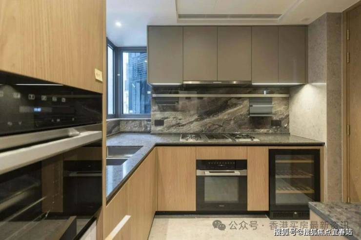 厨房属梗厨设计,连接储物室及洗手间,为住户增添储物位置,空间使用上更为灵活;偌大的工作台面采用亮丽人造石材,墙身采用仿云石纹理瓷砖铺面,美观耐用。