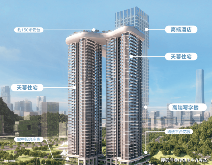 其中裙楼平台花园位于6F,设计了花园洽谈区、观海吧台、下沉会客厅、动静结合玩乐空间;云台则位于150米的高空,云集空中酒店、荧光跑道、无边际泳池等配套。