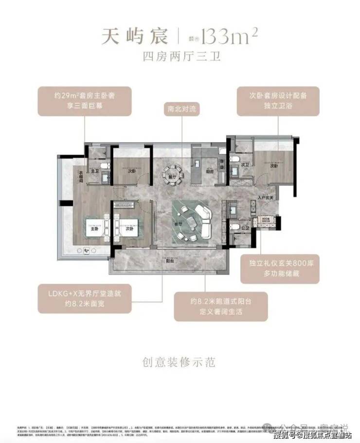 133㎡的4房2厅2卫,设计的是竖厅南北通透格局,进门入户玄关,客厅5.4米开间,餐客厅分离设计,客厅连接次卧出12.3m²的观景大阳台,L型中式+岛台灵动式厨房,公卫三段式干湿分离,得房率约78.27%(不含赠送),阳台主朝东南或西南向。靓点:超大客餐厅南北对流+8.2米长超大观景南向阳台,超大主卧+270°无柱转角飘窗