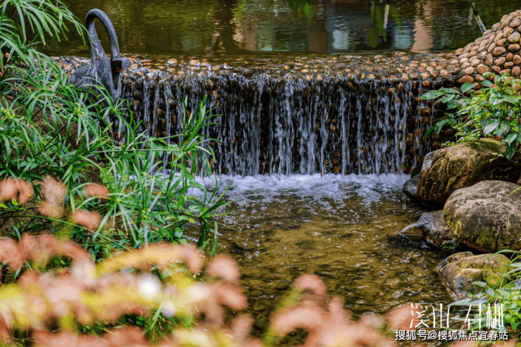 项目内部打造了一条沿着台地蜿蜒的溪流,该水系为市面罕见的活水溪流,贯穿整个社区园林,依据溪岸的曲直不同和地形变化,打造叠水、溪流、瀑布、水潭等多样特色水景,溪岸植物种类繁多,与水流互为风景,沿岸专门设置不同的亲水平台,营造自然灵动的栖心之境。