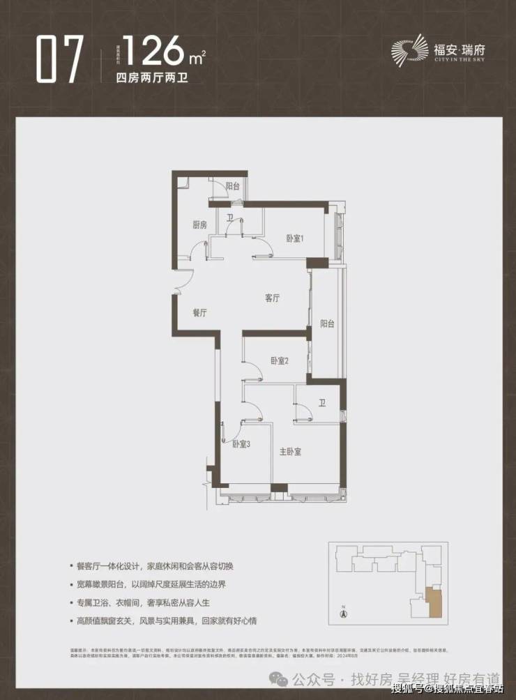 布局:餐客厅一体化设计,7.2米宽景阳台连接客厅与次卧,主卧带独立卫浴与衣帽间。