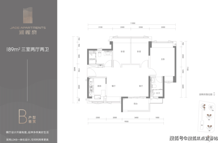 E户型是110㎡四房二卫横厅户型,则是B户型的放大版。西南朝向,户型方正,三个次卧的面积均在9平米以上,主卧18平左右。再加上双面采光对流,基本上不存在采光死角。