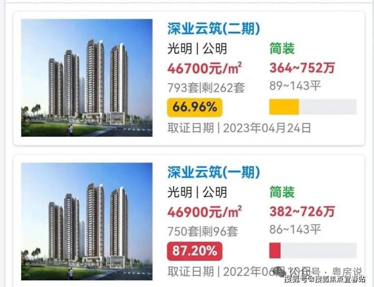 光明公明,深业云筑二期于2023年4月24日取证入市,推出4栋/5栋1/2单元/6栋/7栋,共793套房源,面积有89㎡的3房1卫,112-128㎡的4房2卫,143㎡的5房2卫户型,备案单价4.06万-5.29万/㎡,备案均价4.66万/㎡,总价364-753万/套,在2023年12月底已经交房,目前是现房销售,简装交付。