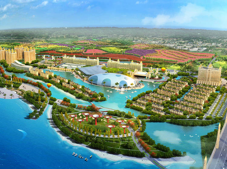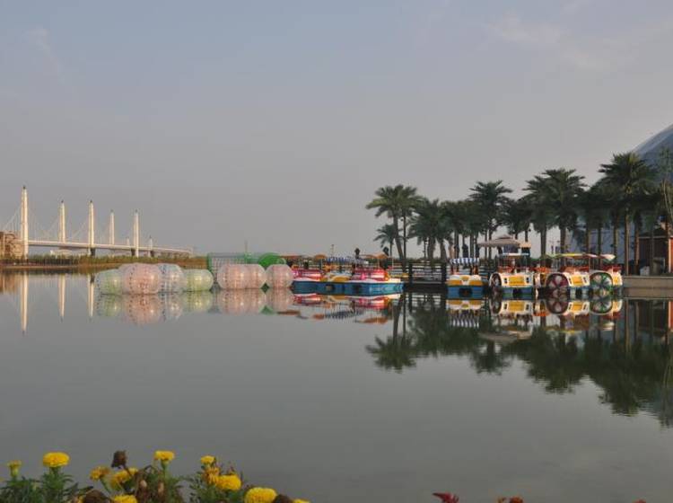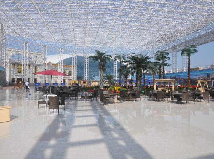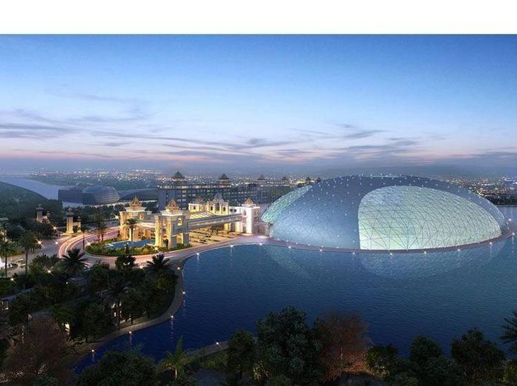 项目主体建筑为海世界戏水乐园,建筑外形远看是一个巨大的半椭形球体,设计灵感来源于中国国家大剧院,建筑技术采用单层轩支拱桁架结构和玻璃采光屋顶,总投资10亿元人民币。室内有能模拟27种海浪的人工造浪区、国内最长的室内漂流河、荣获国家金票奖的超级大喇叭,中国首创的急速鲨吻水磁过山车等207项国际先进的游玩项目。建成后将成为国内较大、西北唯 一的四季恒温室内戏水乐园。