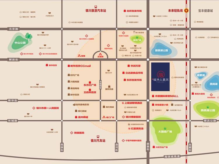 项目周边繁华商圈环绕,银川商城、新华百货、兴庆万达、星星小镇等一系列大型商业集聚,且商业形态丰富,5分钟车程满足各种生活购物需求。