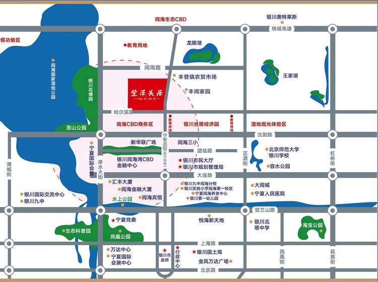 丰泽美居项目地处金凤区丰登镇,东靠万寿路,南临丝路园,西眺典农河,远望贺兰山,空间开阔,交通便利,水系环抱,配套较好,属银川西北部优质生态核心区,是一处告别城市喧嚣、水脉汇集润泽、独享绿色智能化田园生活的居住区。