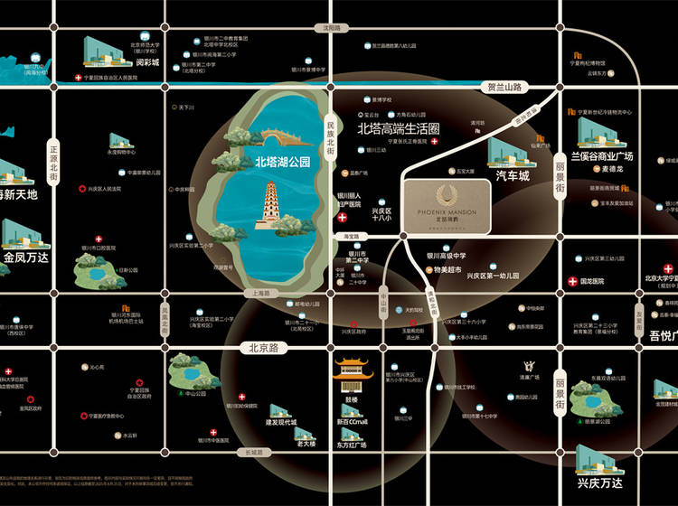 北塔凤鸣位于银川市兴庆区,北塔湖区域,项目1公里辐射北塔湖、海宝公园、兰溪谷商务广场,三公里辐射吾悦广场商圈、新华街商圈,五公里辐射金凤万达、兴庆万达、阅彩城等,国龙医院、宝丰医院、银川市自治区人民医院等环伺,项目隶属北塔高端板块,共建19栋楼,主要以小高层和瞰景高层为主,自建3000㎡业主会所,涵盖泳游馆、健身房、瑜伽室、壁球馆、共享花园等, 配置超50米酒店式入户大堂,采用宝格丽同款奢侈材质,让归家更有仪式感。