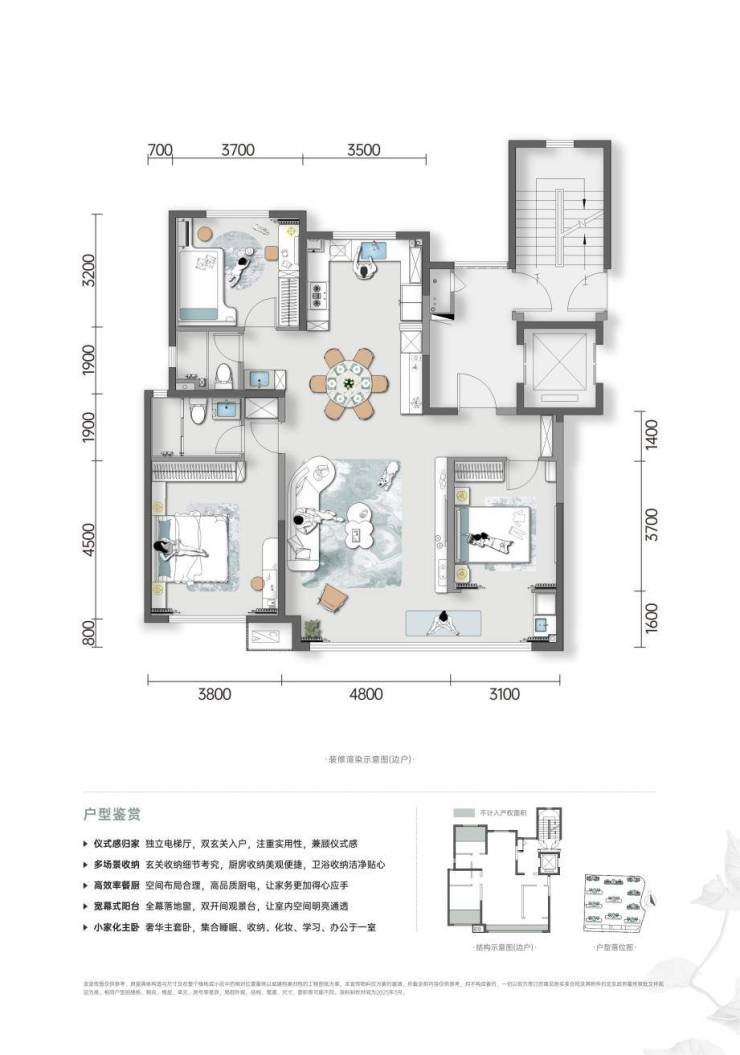 独立电梯厅(带窗)+玄关设计,可以实现高效的入户收纳。约7.25米双通阳台封窗交付,配电动窗帘电机及轨道,同时预留家电洗衣干衣机、扫拖地机器人、壁挂洗衣机位置。阔尺客厅空间,预留影院级观影空间。