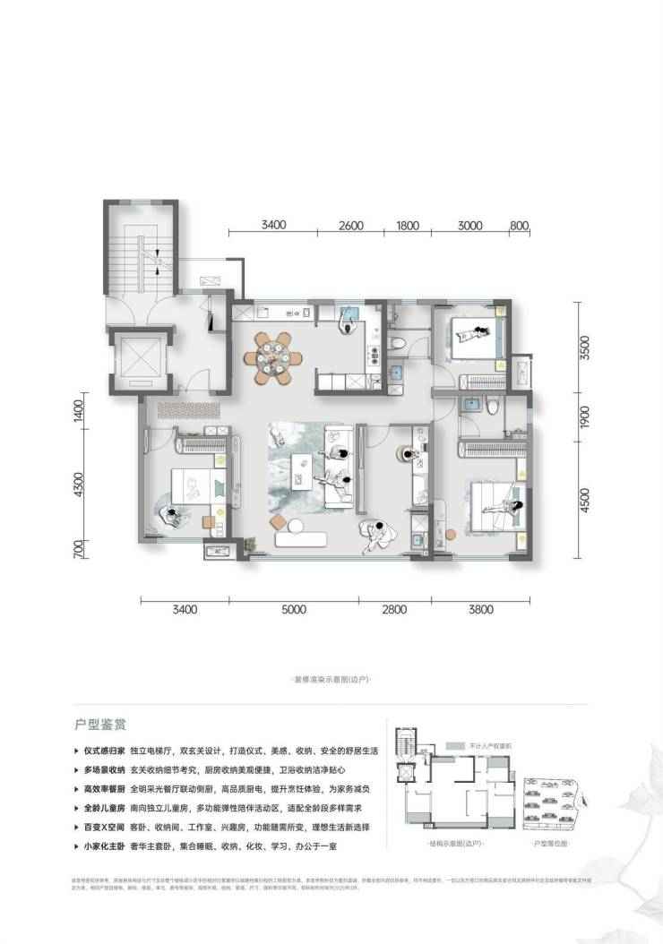 主卧小家化理念融入电动窗帘、感应夜灯等细节,同时其它卧室也都保持了非常舒适的空间尺度,属于可满足多人口家庭的终极改善型产品。