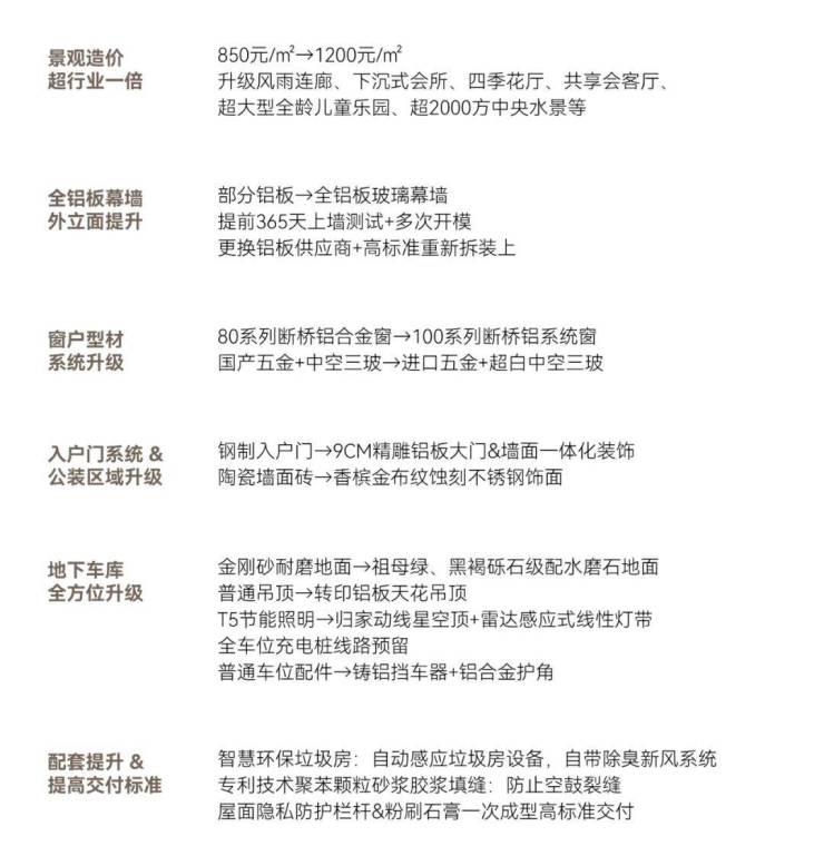 桃李健康·阅海湾壹号“超行业标准一倍” 的严苛要求,斥资千万投入建材升级,景观造价从850元/㎡提升到1200元/㎡、全铝板幕墙外立面提升、窗户型材、入户系统.....一系列全方位的升级,每一处细节的精雕细琢,不仅是对图纸的精准还原,更是对人居理想的超越式兑现,让建筑成为可触摸的品质宣言。
