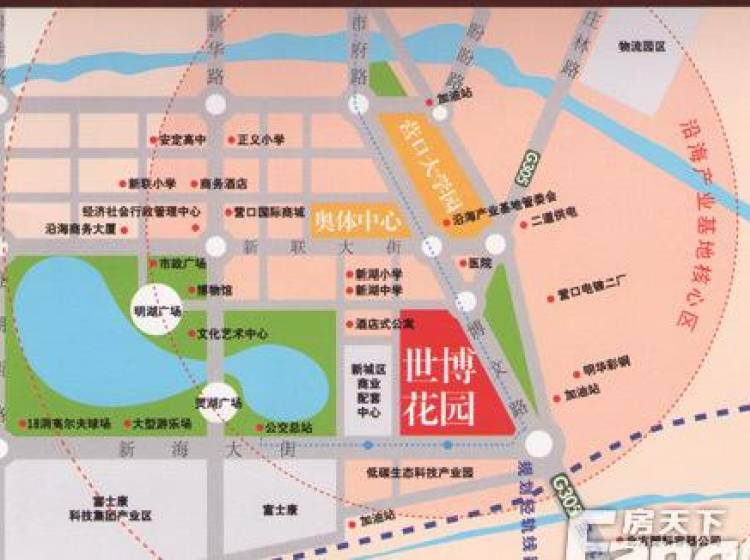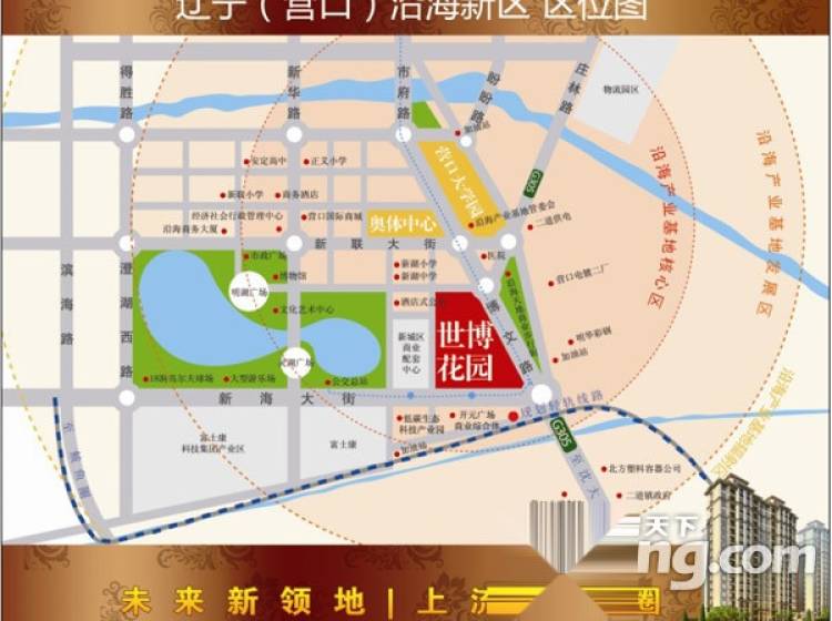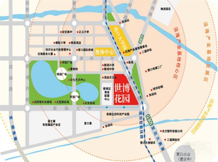幼儿园、学校、医院 社区内从北京引进了一家师敎标准高、功能齐全、软硬件设施好、营养配餐的双语幼儿园。它将是营口市最好的。 社区北面新湖大街与奉贤路交汇处有新湖小学及新湖中学。 社区北面1200米建有新城区最大最完善最现代化的医院。 周边配套 沿新海大街往西800米,占地11万多平方米建面达到20多万平米的新城商业配套中心,现已竣工封顶正在做内外装修。建成后集商场、餐饮、电影院、超市、建材、家具城、家电城等等。 社区内从北京引进了一家师敎标准高、功能齐全、软硬件设施好、营养配餐的双语幼儿园。它将是营口市最好的。
