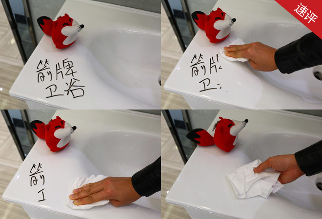 因为面盆的使用频率很高,一款好的浴室柜的面盆必须是耐脏好清洁的。为了测试这方面的性能,小编拿油性笔在面盆上写字,等待5分钟后,用纸巾即可马上抹除,说明这款产品面盆光滑不挂污。