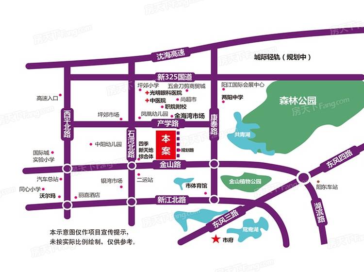【金雅园】坐落于金山路北侧433号(凯珀酒店斜对面),占据城市中轴金山大道,交通便捷,毗邻阳江二运汽车站,出行无忧。项目毗邻百年老校两阳中学、职院附校,以及金凤凰幼儿园等城北区优质的教育资源,学习气氛浓厚,提供优质人文氛围。新中医院、公共医院、光明眼科医院为健康保驾护航,森林公园、金山植物公园是茶余饭后静享闲散时光的好去处。家门口的金海湾肉菜市场,为日常生活提供新鲜材料,尽享便利。