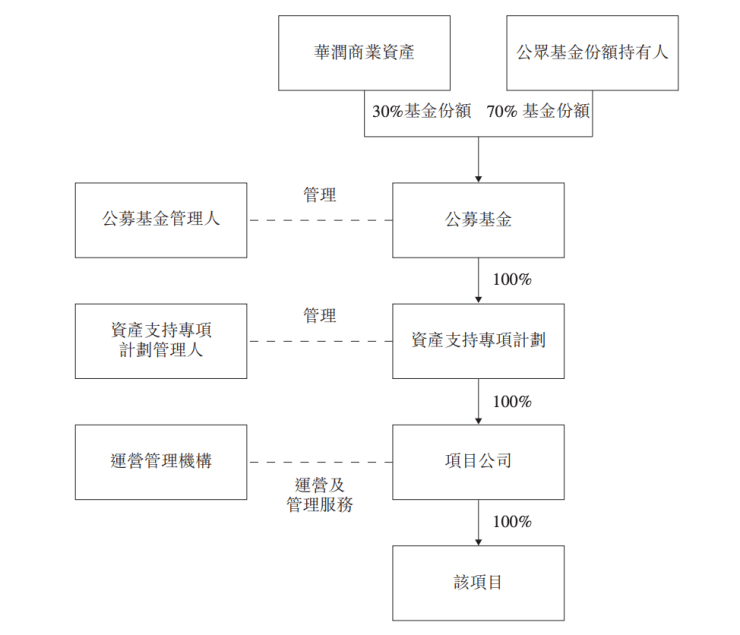 建议分拆及建议上市完成后基础设施REIT的架构为:华润商业资产持有30%基金份额,公众基金份额持有人持有70%基金份额。