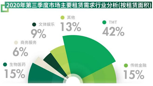 需求方面,TMT(科技新媒体产业42.1%)、传统金融(14.8%)和生物医药(14.8%)是三季度西安写字楼市场的主要驱动力,且3000平方米以上的大面积租赁需求增加。其中,在线教育持续扩张,猿辅导、作业帮、掌门教育等在线教育机构分别在曲江、高新、城北有大面积成交,租赁面积均在3000平方米以上。传统金融行业租赁需求集中在高新,工行研发中心、广发银行分别入驻人寿和国寿金融中心,租赁面积均在5000平方米以上。总体来看,高新依然是西安写字楼三季度租赁的热门区域,曲江、城北也是较为活跃的成交板块。