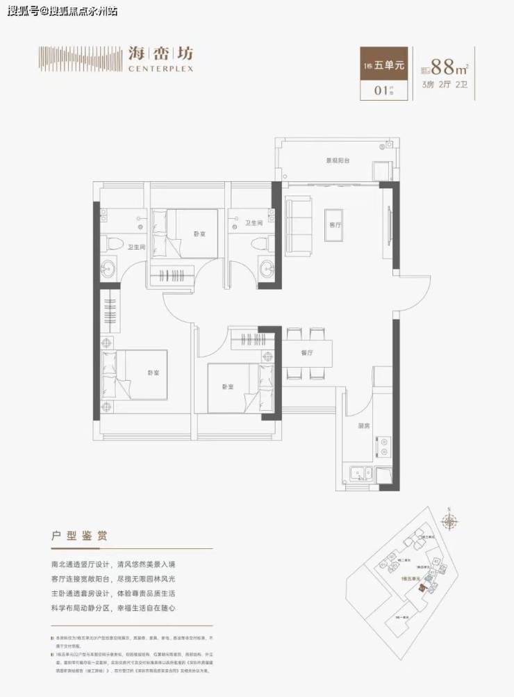 88㎡的3房2厅2卫(1栋2单元01户型),设计的是横厅南北通透格局,进门独立玄关,全屋飘窗,三开间朝南,U型厨房,得房率:73.88%(不含赠送),阳台主朝东南向。